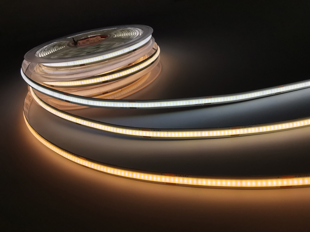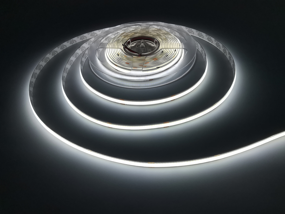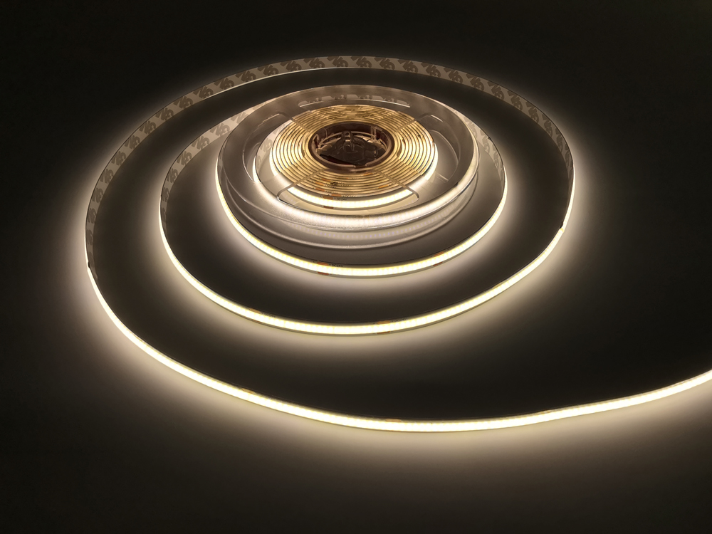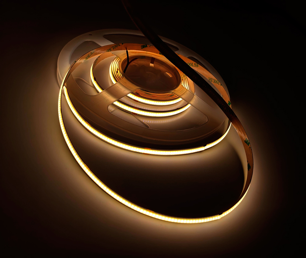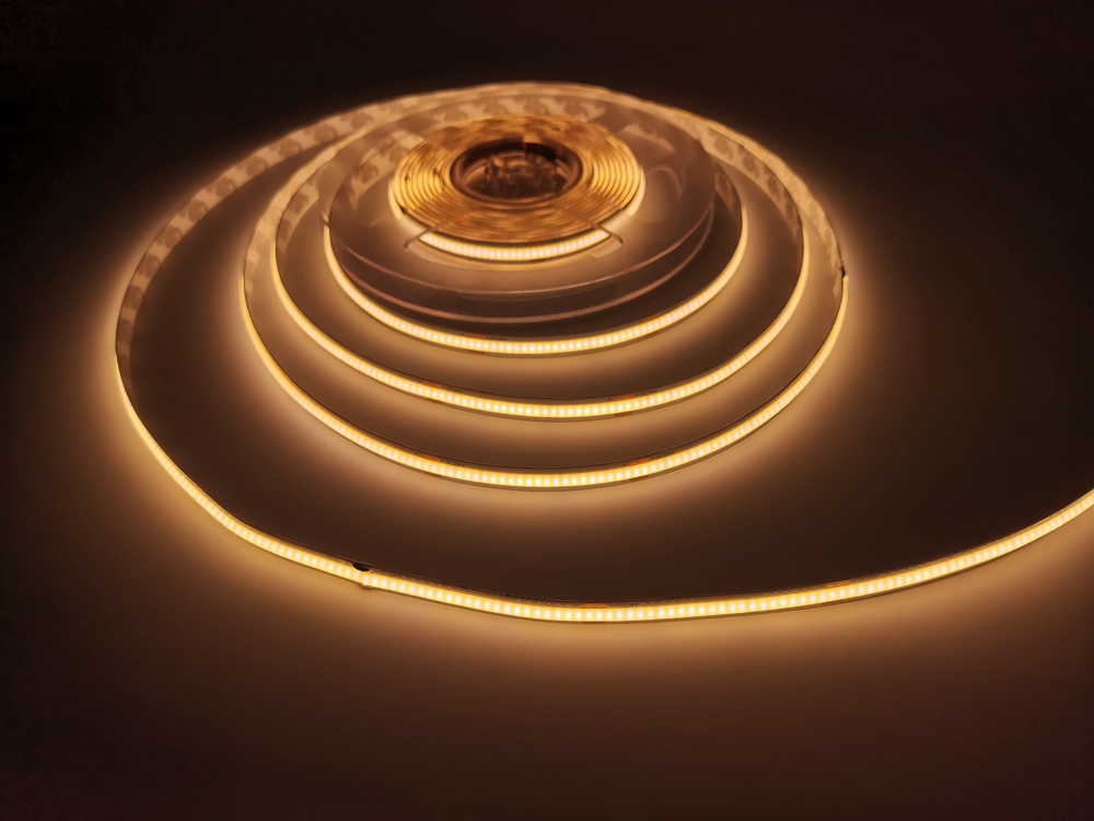 • Fita LED COB flexível não estanque com iluminação contínua e uniforme sem pontos de luz.