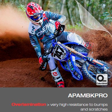 Laminação calandrada para proteger impressões em partes plásticas de motas e bicicletas sujeitas a pequenos impactos e abrasões.