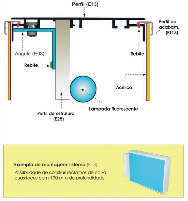 Perfil de alumínio com 130 mm para caixas de dupla face.